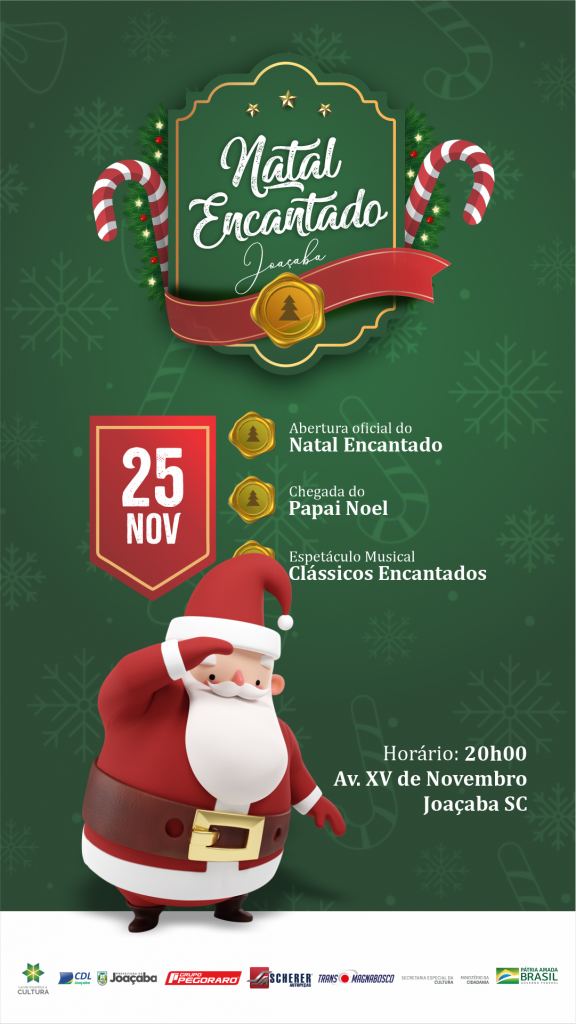 A abertura do Natal Encantado vai acontecer na próxima sexta-feira, dia 25, a partir das 20h na avenida XV de Novembro em frente a prefeitura. Entre os atrativos a chegada do Papai Noel e o Mega Espetáculo infantil “Clássicos Encantados”. O espetáculo conta com mais de 30 integrantes, ballet, mais de 100 figurinos e 100% cantado ao vivo. A mega produção é baseada nos grandes musicais da Broadway com a Cinderela, a Bela e a Fera, o Mágico de Oz, Rei Leão, Jasmine e Aladdin e muito mais.