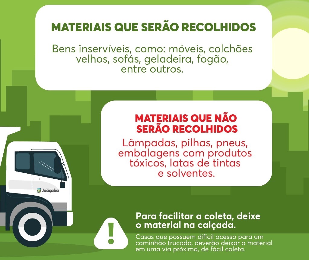 Desta forma, a Secretaria solicita aos moradores que desejam descartar entulhos e bem inservíveis como móveis, colchões velhos, sofás, geladeira, fogão ou algum outro material de grande porte para que deixem na calçada até às 8h da manhã do dia da ação. Casas que possuem difícil acesso para um caminhão trucado, deverão deixar o material em uma via próxima, de fácil coleta.