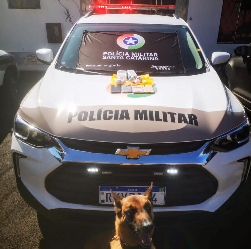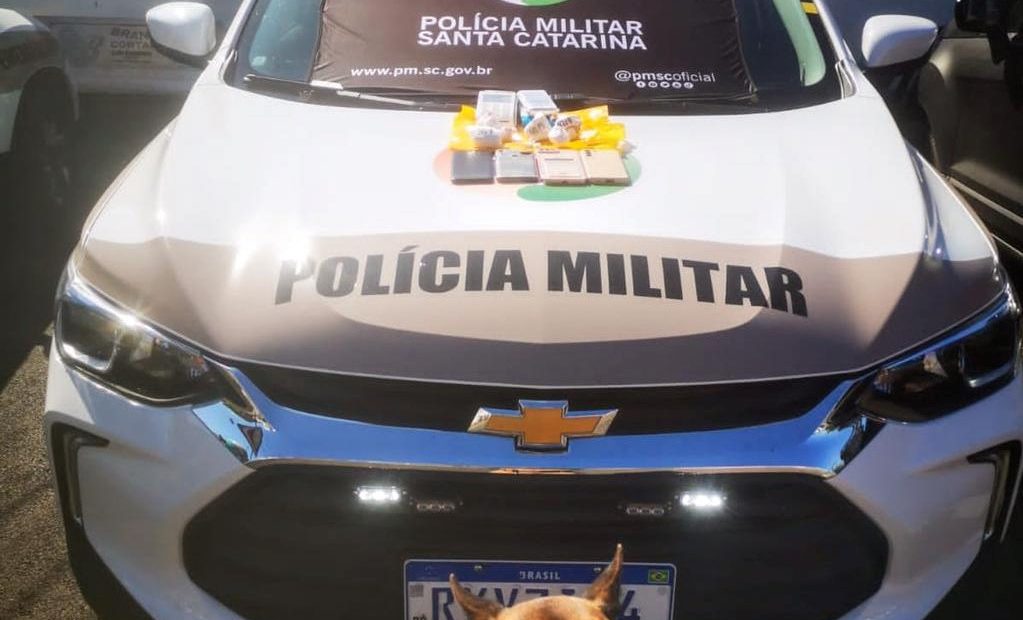 Os militares deslocaram-se para fazer a abordagem na BR-282, trevo de Erval Velho.Os policiais realizaram a abordagem e no veículo estava um homem e três mulheres. Nada foi encontrado no primeiro momento durante a revista no carro e busca pessoal, mas devido à denúncia, foi solicitado apoio do canil e o cão farejador encontrou embaixo do banco traseiro, uma sacola plástica com embalagens envolvidas em um plástico transparente, sendo constatado um total de 227 gramas de cocaína. Uma balança de precisão, um terminal móvel de cartão e quatro celulares estavam com os abordados. Todo o material foi apreendido.