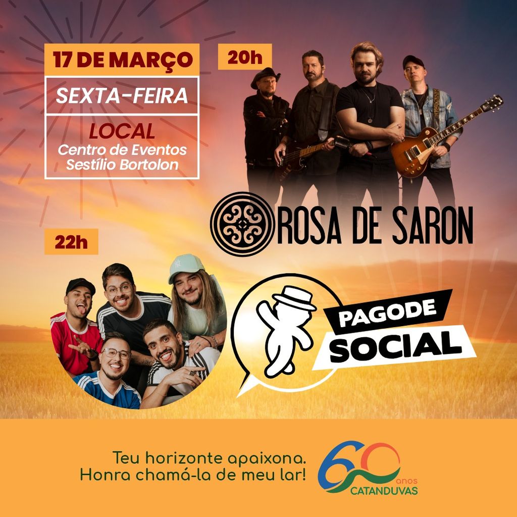 Na sexta-feira, dia 17, a partir das 20 horas, no Centro de Eventos Sestílio Bortolon o show é com Rosa de Saron. O evento é com entrada franca. A banda brasileira de rock cristão formada em 1988 dentro do movimento de Renovação Carismática Católica, na cidade de Campinas, é conhecida por ter sido uma das precursoras do metal cristão no Brasil.