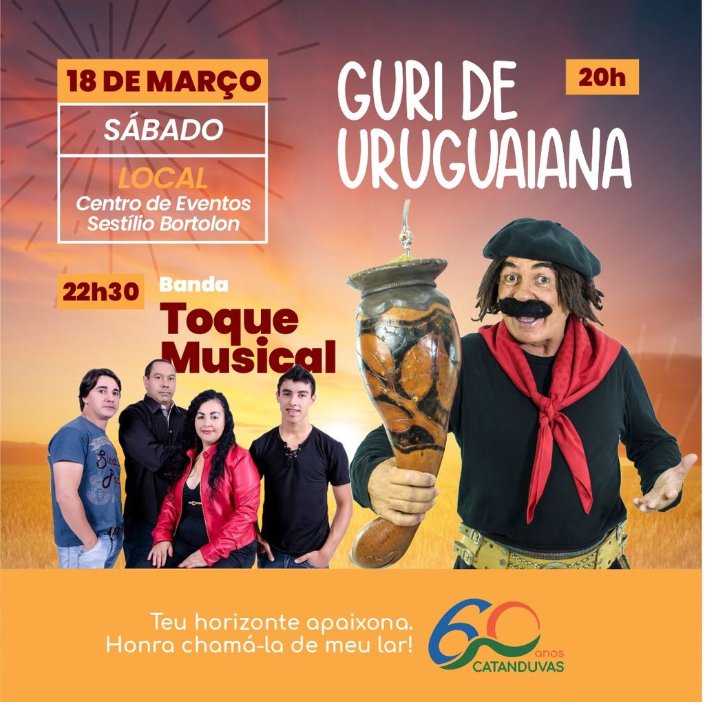 No sábado, dia 18, também no Centro de Eventos e com entrada franca, o humor toma conta da festa com o já conhecido Guri de Uruguaiana, a partir das 20 horas. A expectativa é grande para o show de Jair Cláudio Kobe, nome do ator que interpreta um dos grandes humoristas brasileiros. Logo após, baile com a banda Toque Musical.