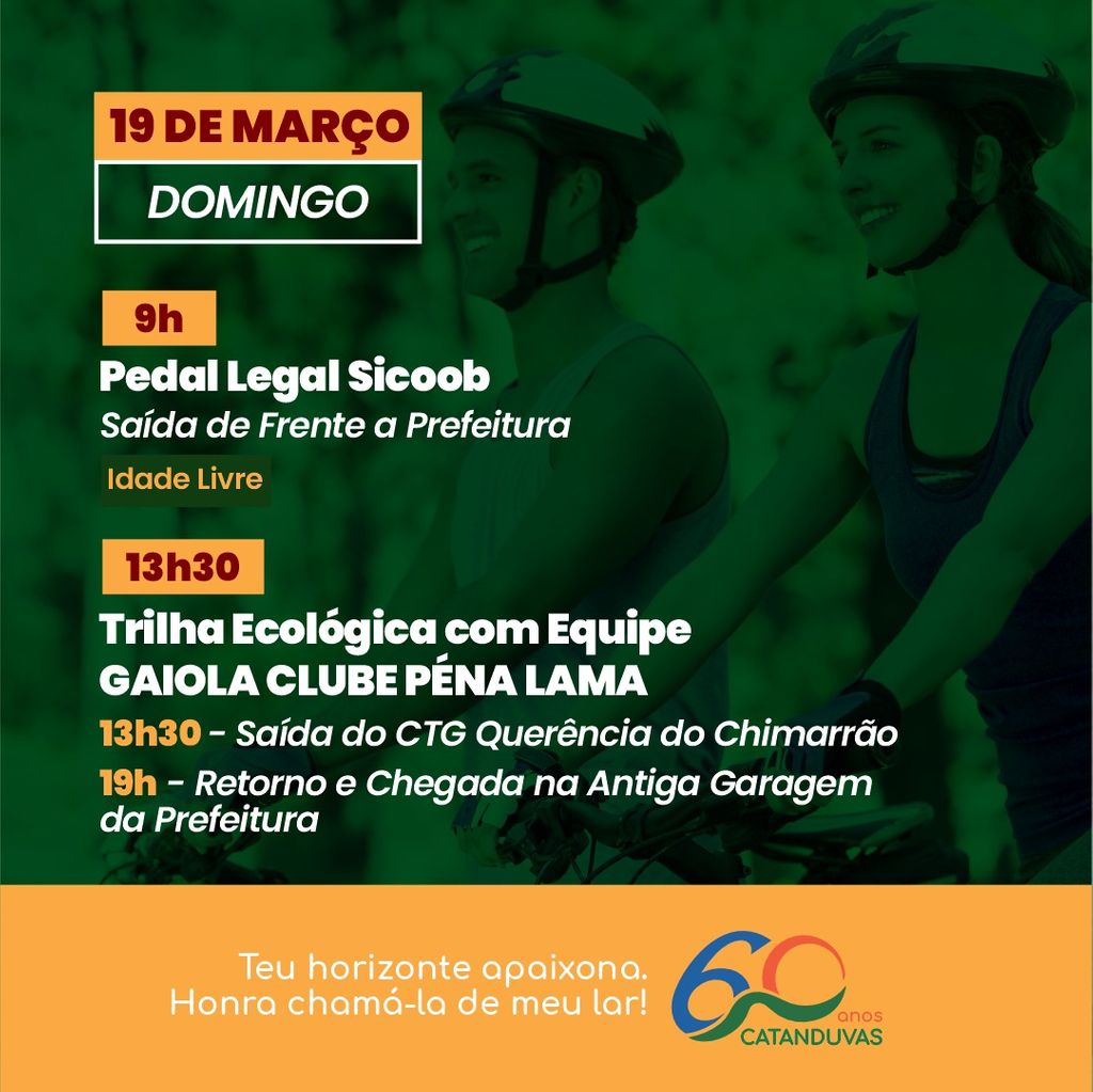 No domingo dia 19, as comemorações iniciam cedo. Às 9 horas Pedal Legal com apoio do Sicoob e da Câmara de Dirigentes Lojistas (CDL) de Catanduvas. Já a tarde, às 13h30 Trilha Ecológica com Equipe Gaiola Clube Pé na Lama e no mesmo horário início da Festa de Aniversário dos 60 anos de Catanduvas, em frente a Prefeitura Municipal, incluindo atividades de lazer para as crianças, toboágua gigante, brinquedos infláveis, passeio de trem, mateada, homenagens, apresentações e corte do bolo dos 60 anos.