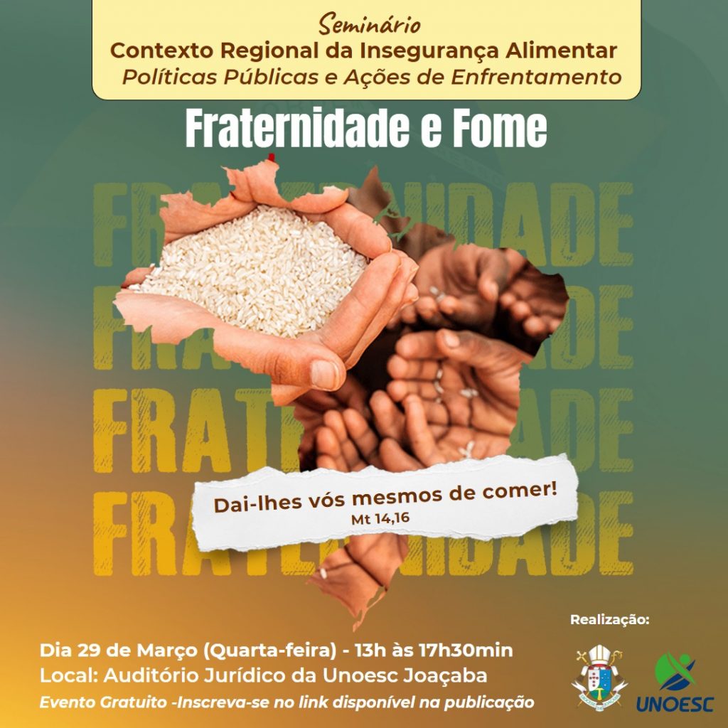 No próximo dia 29 de março, das 13h às 17h, a Diocese de Joaçaba e a Unoesc se unem para promover o Seminário Contexto Regional da Insegurança Alimentar – Políticas Públicas e Ações de Enfrentamento. O evento acontecerá no Auditório Jurídico da Unoesc em Joaçaba e é destinado para profissionais das áreas de saúde, assistência social e integrantes de movimentos, pastorais e serviços e para a comunidade em geral que atua em favor da superação da fome em nossa região.