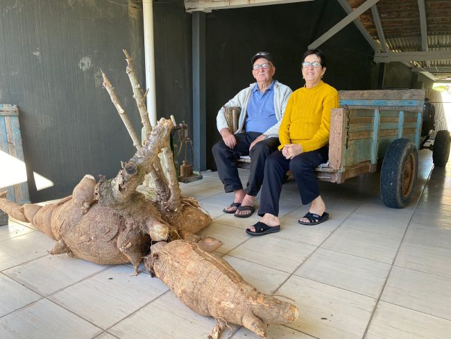 Para o casal Otávio e Wilma Hoeppner, o plantio de verduras e leguminosas no terreno é comum, mas a colheita desta mandioca, com certeza, os surpreendeu.