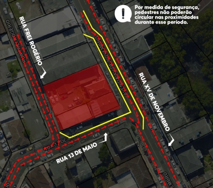 No domingo (21), durante todo o dia, uma das pistas de rolamento da Avenida XV de Novembro e uma das pistas da Rua 13 de Maio estarão fechadas. Na XV de Novembro, a pista adjacente à edificação será desviada. É importante ressaltar que, por medida de segurança, pedestres não poderão circular nas proximidades durante esse período.