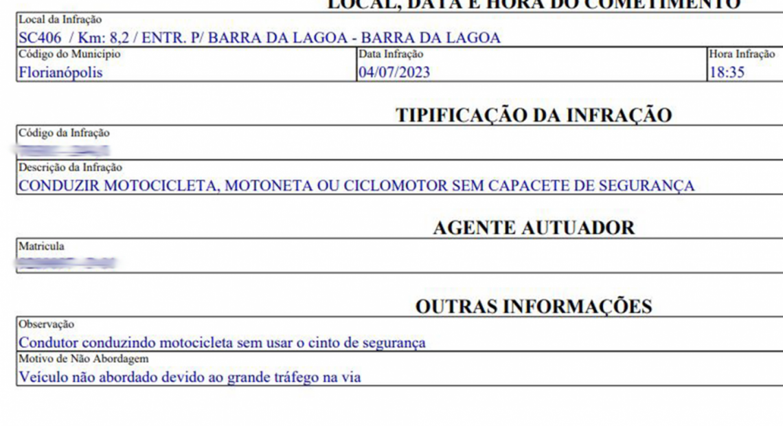 Você já imaginou ser notificado com uma multa por conduzir uma motocicleta sem cinto de segurança? Pois é, o caso inusitado aconteceu na última terça-feira (07), na SC-406, em Florianópolis, no litoral catarinense.