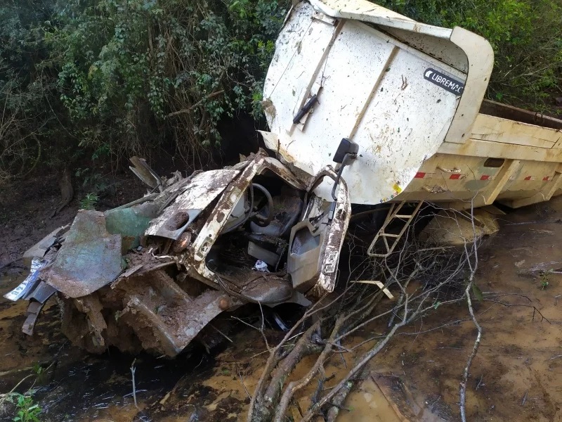 Caminhão-caçamba de Prefeitura fica destruído ao cair em lago
