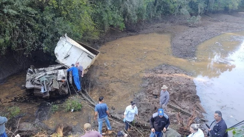 Um caminhão-caçamba da Prefeitura de Alto Bela Vista despencou dentro de um lago na manhã desta quinta-feira (31) na região de Entre Rios, no interior do município.