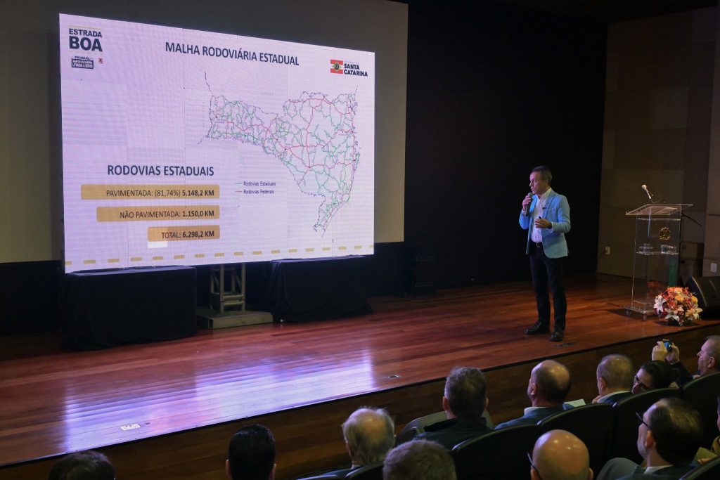 O evento foi realizado no cinema do Centro Integrado de Cultura (CIC), em Florianópolis. Do local, o governador vai ao Meio-Oeste catarinense para dar início às obras da estrada que liga Capinzal e Piratuba, às 15h30. Serão 60 obras.