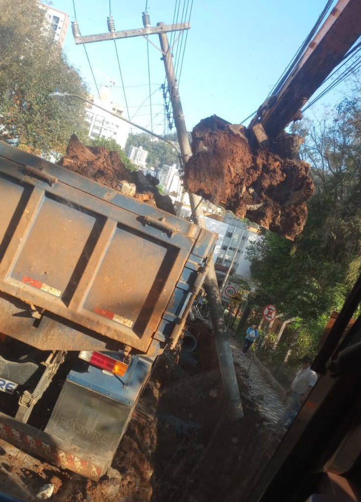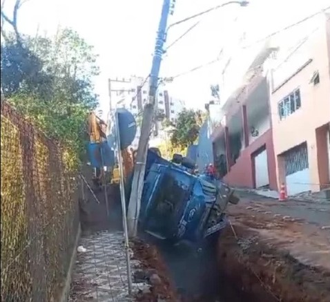 Mais tarde, na sequência dos trabalhos, um caminhão da mesma empresa acabou caindo dentro da vala, após um poste ter atingido o veículo.