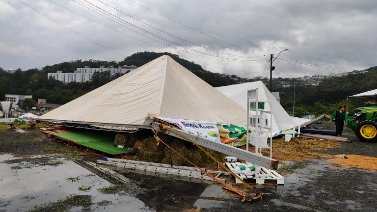 O temporal que atingiu diversos municípios do Oeste catarinense na tarde desta segunda-feira, dia 4, provocou estragos nos estandes externos do Parque de Exposições da Expo-Concórdia. Fortes ventos atingiram o local por volta das 16 horas.