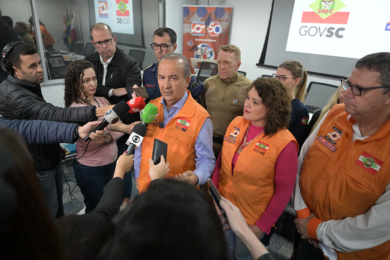 O governador Jorginho Mello concedeu uma entrevista coletiva no começo da noite desta sexta-feira, 6, na sede da Defesa Civil estadual. Ele falou sobre a projeção climática para os próximos dias e o que foi tratado na reunião conjunta com as secretarias e órgãos do estado envolvidos no trabalho de minimizar os possíveis estragos das chuvas. A partir desta sexta se junta ao grupo também o Exército Brasileiro que deve participar das ações quando for necessário.