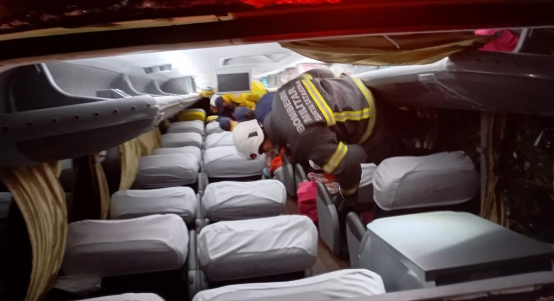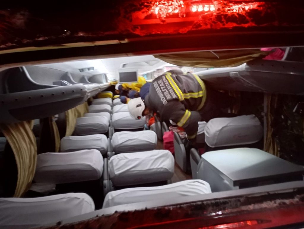 Um ônibus com que saiu de Erechim, no Alto Uruguai gaúcho, se envolveu em acidente na madrugada desta quarta-feira (14) na BR-282 em Lages, na serra catarinense. O fato ocorreu próximo ao Parque da Saudade, imediações do trevo com a BR-116. Por volta da 1h15 o Corpo de Bombeiros e SAMU foram acionados e deslocaram as equipes de socorro.No local verificaram que o veículo Scania Marcopolo com placas padrão Mercosul conduzido por um homem de 31 anos havia tombado. O veículo se deslocava para Itapema, no litoral norte catarinense, com 37 passageiros mais dois motoristas, num total de 39 pessoas.Quinze passageiros tiveram ferimentos leves como escoriações, luxações, contusões e ferimentos cortantes na face e em membros. Dos 15 feridos, todos foram conduzidos pelos bombeiros e SAMU, sendo 14 maiores de idade conduzidos para o Hospital Nossa Senhora dos Prazeres e um menor conduzido até o Hospital Infantil Seara do Bem.No local, 20 dos passageiros ainda encontravam-se dentro do ônibus sem conseguir sair do veículo pelo fato de as portas estarem obstruídas pela vegetação e o ônibus lateralizado. Foi necessário realizar o corte do para-brisa traseiro com a serra sabre para acessar o restante dos passageiros e retirá-los de dentro do veículo.Por se tratar de um aclive acentuado foi necessário utilizar um cabo de segurança para extrair os 20 passageiros, sendo que uma feminina necessitou ser removida imobilizada em maca rígida estando politraumatizada.Após 40 minutos de ação das equipes, todos estavam fora do veículo, não havendo óbitos ou passageiros com lesões graves. Dos 24 passageiros, sendo três menores e 21 adultos, todos foram encaminhados para uma área segura onde aguardaram a finalização das ações de resgate, sendo conduzidos até as instalações do quartel do 5º BBM, pois não tinham condições seguras para permanecerem sem qualquer tipo de assistência às margens da rodovia, sendo um local muito perigoso.Terminada a ação, o trânsito foi liberado, pois o ônibus encontrava-se fora da pista e permaneceu no ônibus cuidando dos pertences. O segundo motorista, de 67 anos, não se feriu. O motorista que estava conduzindo no momento do acidente também permaneceu no local com a Polícia Rodoviária Federal.Com a liberação do local, todos os passageiros que não se feriram, exceto os motoristas, foram acolhidos no refeitório do 5º BBM, pois não tinham qualquer amparo e permaneceriam na chuva sem esse apoio até o dia seguinte.Após algumas horas de espera, realizados contatos com os órgãos da Defesa Civil e Assistência Social foi conseguido realocar todos os passageiros em abrigos temporários bem como hospedagens em hotéis para aguardar a remoção de outro ônibus para Erechim.O desfecho da ocorrência se deu às 5h com a alocação de todos os envolvidos no acidente bem como o apoio da Secretaria de Assistência social no acolhimentos dos ocupantes do veículo.