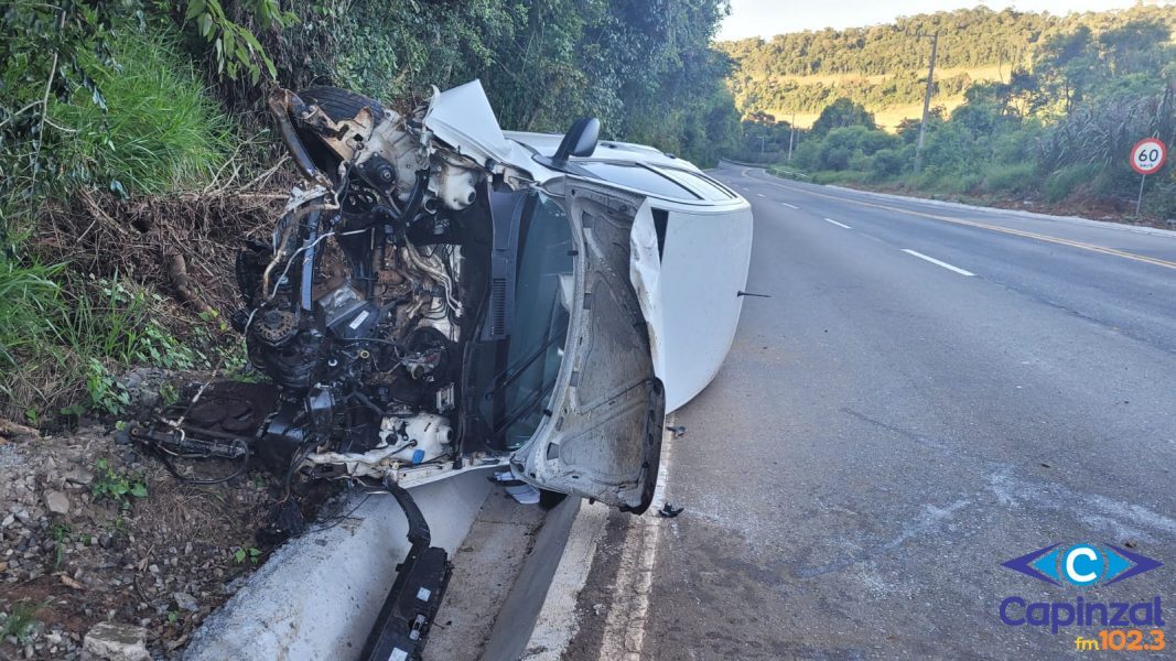 Um veículo ficou destruído na manhã deste domingo, dia 24, depois de sair da pista, bater no barranco e capotar na SC 150, interior de Lacerdópolis.