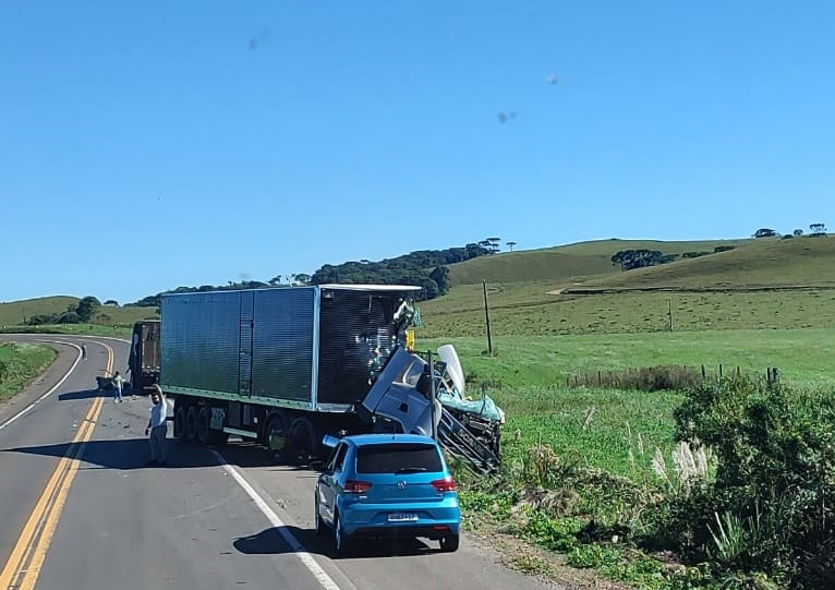 Uma carreta Scania de Concórdia se envolveu em uma violenta colisão, na tarde deste domingo (21), por volta das 14h. O acidente aconteceu na BR-153, na região do Horizonte. Informações apontam que um enxame de abelhas teria invadido a cabine do veículo, fazendo o motorista perder o controle e colidir contra outra carreta que fazia o sentido contrário.