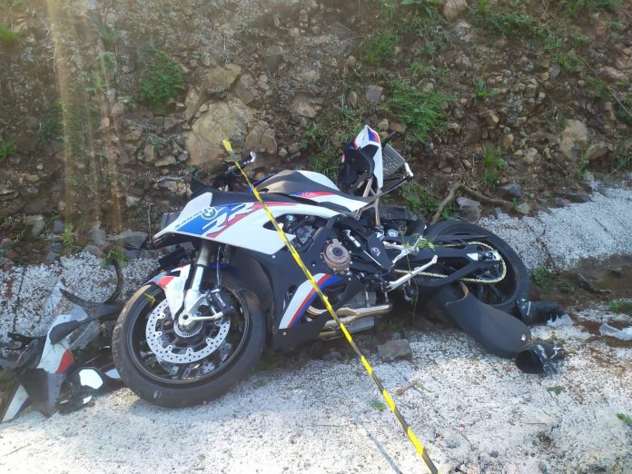 O local, conhecido como “Asfalto Quebrado”, registrou uma saída de pista seguida de choque em barranco envolvendo uma moto BMW 1000.