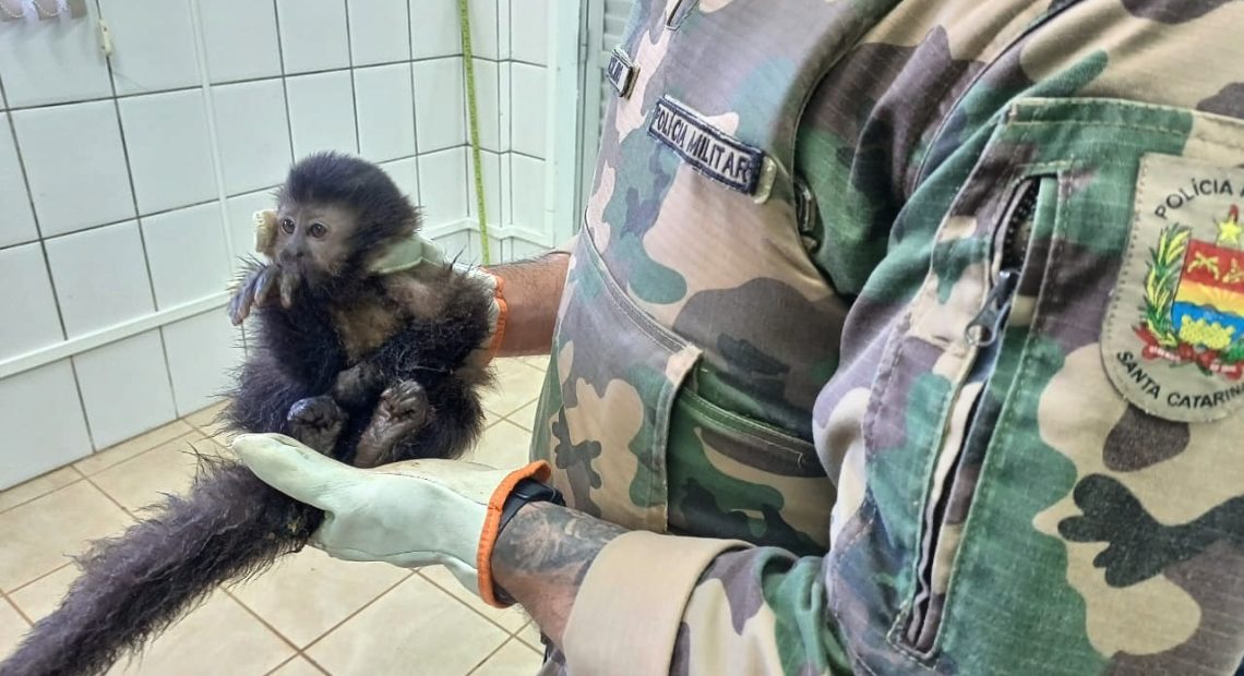 O filhote de macaco-prego (Sapajus nigritus) foi encontrado com uma fratura e um ferimento de perfuração no ombro. A origem desses ferimentos ainda não foi confirmada, mas os policiais militares ambientais agiram rapidamente para garantir o bem-estar do pequeno primata.