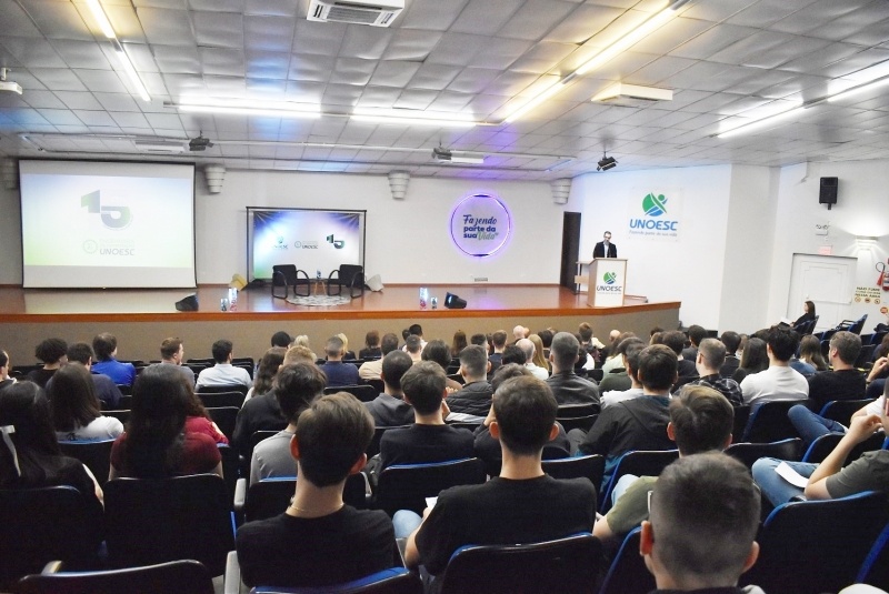Um evento comemorativo realizado no Auditório Afonso Dresch, na Unoesc Joaçaba, marcou os 15 anos do curso de Engenharia de Computação. A cerimônia contou com a presença de estudantes, professores, diplomados, ex-coordenadores e dirigentes da Instituição.