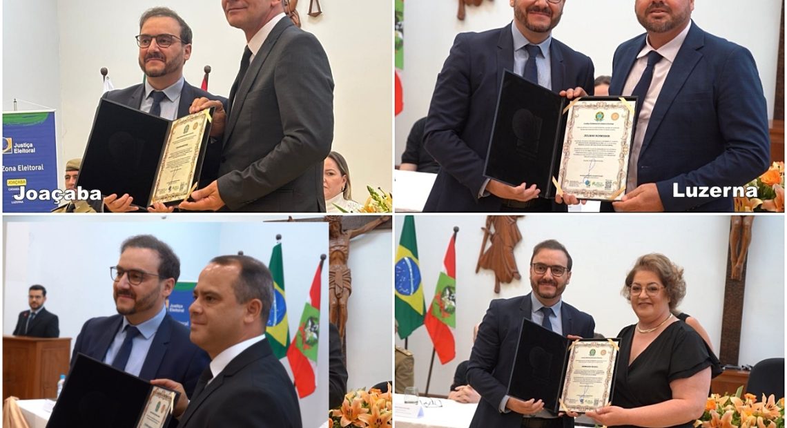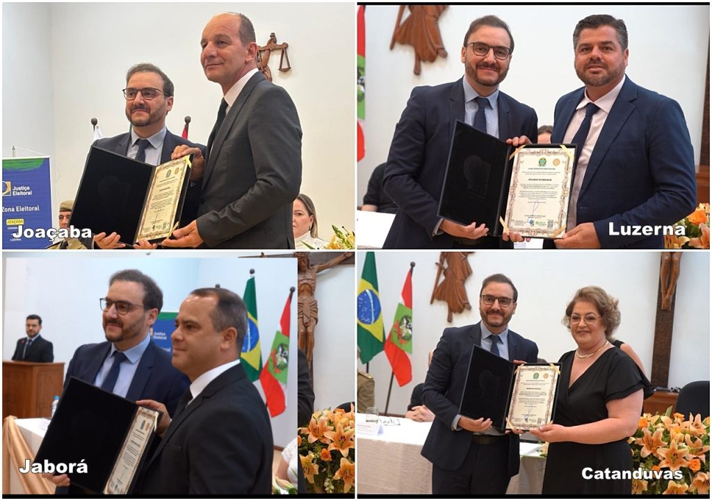A Justiça Eleitoral realizou ontem a cerimônia de diplomação dos candidatos eleitos nos municípios de Joaçaba, Luzerna, Jaborá e Catanduvas. O evento, que oficializa a vitória e habilita os eleitos a assumirem seus respectivos cargos a partir de janeiro, incluiu a entrega dos diplomas aos prefeitos e vereadores escolhidos pela população no pleito deste ano.