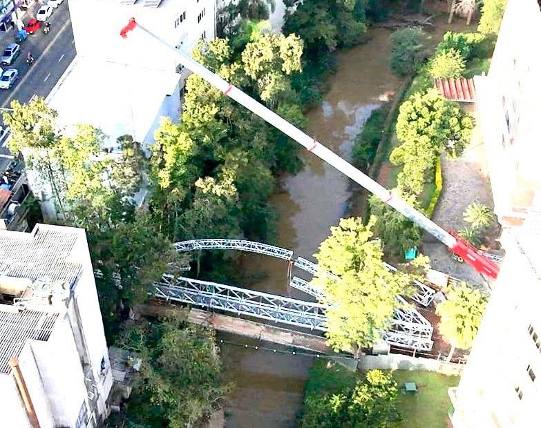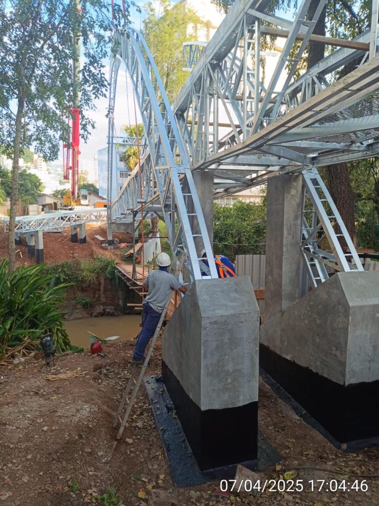 Nesta semana, uma nova etapa importante foi concluída: a instalação dos arcos principais da passarela. Para isso, foi necessário o uso de um guindaste de grande porte, com capacidade para 100 toneladas, que operou sob criteriosas condições de segurança para erguer as estruturas metálicas no local.