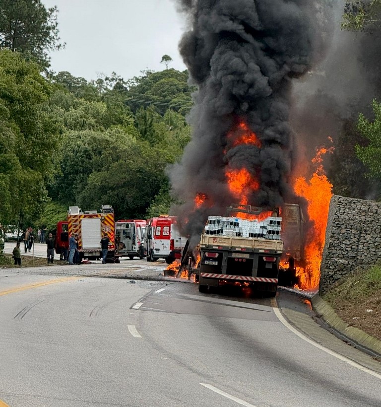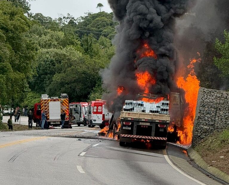O veículo pegou fogo na ocorrência (veja o vídeo logo abaixo), registrada na altura do distrito de Caldas da Imperatriz. Conforme o Corpo de Bombeiros, o acidente também envolveu outros cinco veículos — quatro de passeio e uma carreta.
