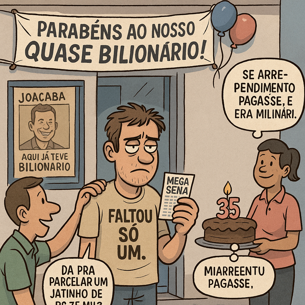 Por enquanto, seguimos com nosso “quase bilionário”. Um título simbólico, é verdade, mas que, convenhamos, rende boas histórias — e ótimos brindes nas rodas de amigos. Afinal, perder por um número não é para qualquer um… é para quem tem coragem de sonhar grande e um leve azar na conta..