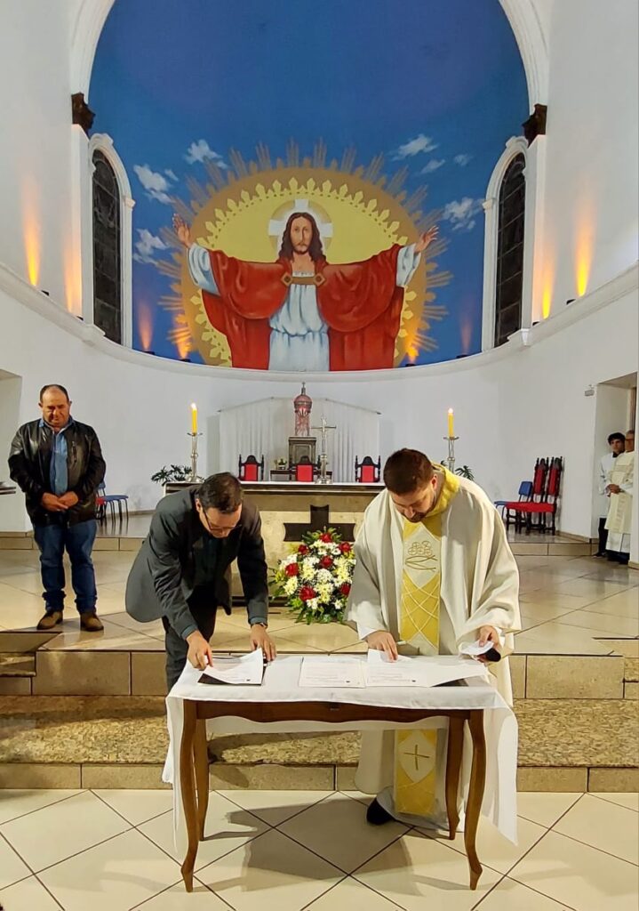 Herval d’Oeste oficializou, nesta segunda-feira (11 de agosto de 2025), o Senhor Bom Jesus como padroeiro do município. A lei foi sancionada pelo prefeito Ronaldo da Rosa durante uma celebração religiosa na Igreja Matriz, conduzida pelo padre Gilvani Capitani. O projeto partiu da bancada do PP na Câmara de Vereadores e foi aprovado por todos os legisladores.