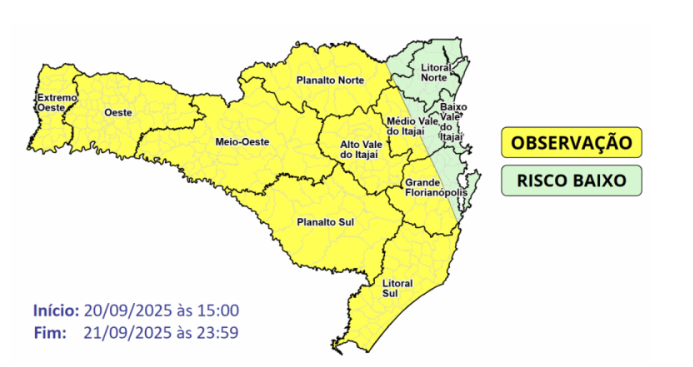 A Defesa Civil de Santa Catarina emitiu um alerta para a ocorrência de temporais entre a tarde de sábado (20) e a noite de domingo (21). O Oeste catarinense está entre as regiões com maior risco para eventos mais intensos, devido à combinação de forte calor, alta umidade e a formação de uma frente fria que avança pelo estado.