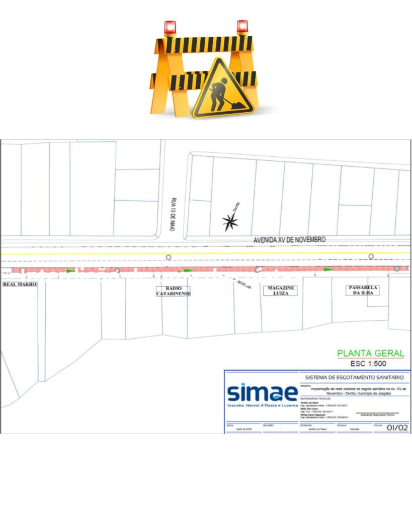 O Setor de Trânsito, Transportes e Mobilidade Urbana de Joaçaba informa que, a partir desta quinta-feira, 2 de outubro, o SIMAE (Serviço Intermunicipal de Água e Esgoto) dará início às obras de implantação de rede de esgoto na Rua XV de Novembro. O trabalho será realizado no trecho compreendido entre a loja Real Macro e a Lorenci Homem.