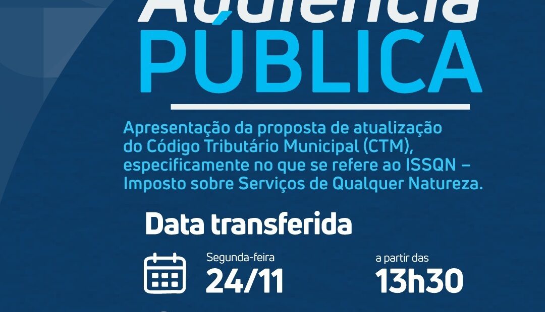 A Prefeitura de Joaçaba informa que a audiência pública sobre a alteração da legislação do ISSQN (Imposto Sobre Serviços de Qualquer Natureza), anteriormente marcada para o dia 13 de novembro, foi transferida para o dia 24 de novembro (segunda-feira), às 13h30, na Câmara de Vereadores de Joaçaba (Rua Tiradentes, nº 872, Centro).