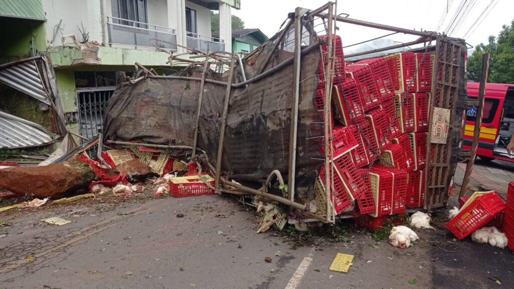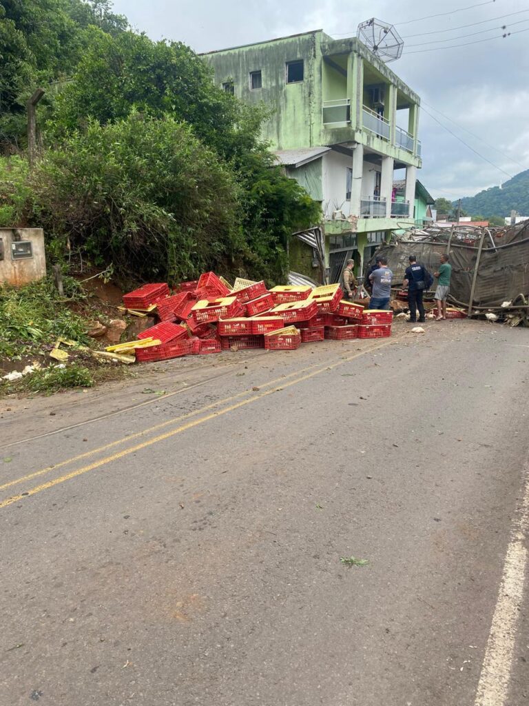 Um grave acidente foi registrado no início da manhã desta quinta-feira (13) na Rua Santa Catarina, em Herval d’Oeste. Um caminhão carregado de frangos perdeu o freio enquanto descia uma ladeira íngreme e acabou atingindo violentamente um automóvel, deixando três pessoas presas nas ferragens.