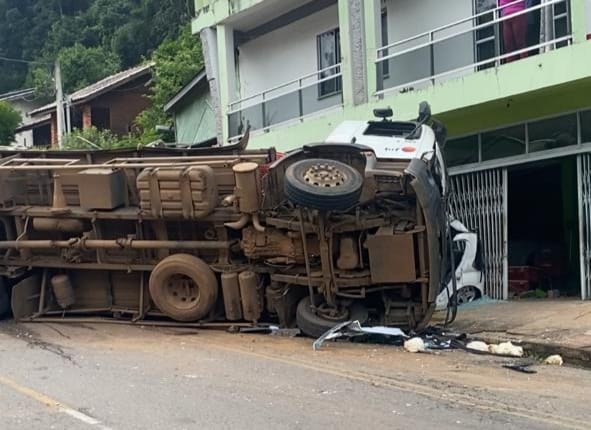 Caminhão sem freio causa grave acidente em Herval d’Oeste; três pessoas ficam presas nas ferragens