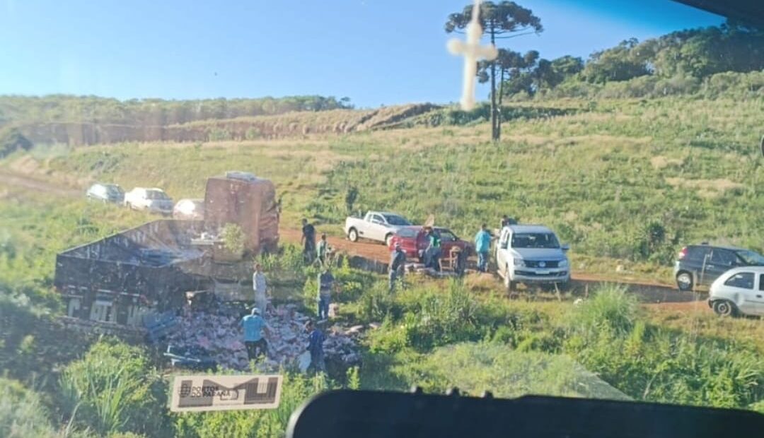 Um acidente no início da manhã desta terça-feira na BR-282, próximo ao trevo de Jaborá, envolveu uma carreta carregada de leite condensado que acabou saindo da pista. A imagem enviada à Rádio Catarinense mostra o veículo tombado em meio à vegetação, enquanto várias pessoas se aproximam da carga espalhada pelo local.