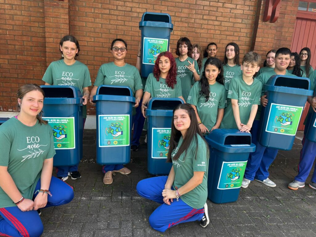 Estudantes do projeto “Eco Ação” auxiliam na instalação de 30 novas lixeiras em Herval d’Oeste