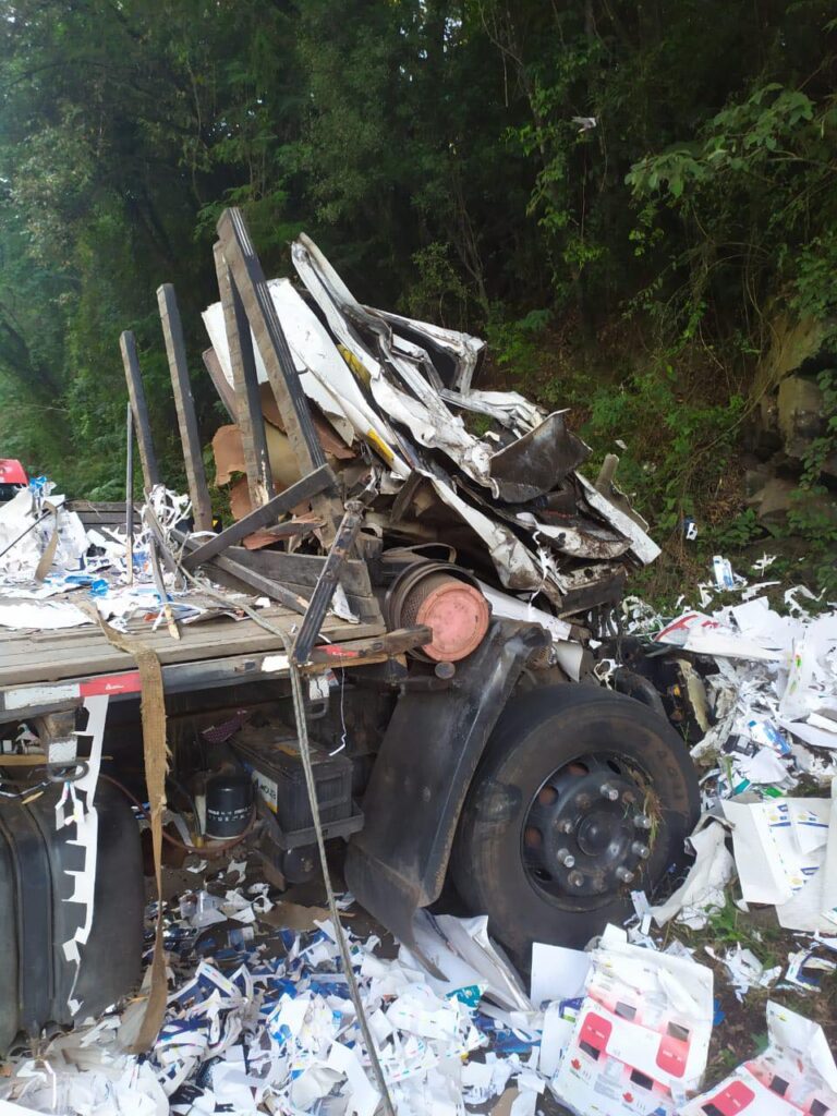 Quando os bombeiros chegaram ao local, encontraram a cabine do caminhão totalmente destruída, tamanha a violência da saída de pista. Mesmo assim, o condutor de 36 anos, conseguiu sair do veículo por conta própria e estava sentado no acostamento.