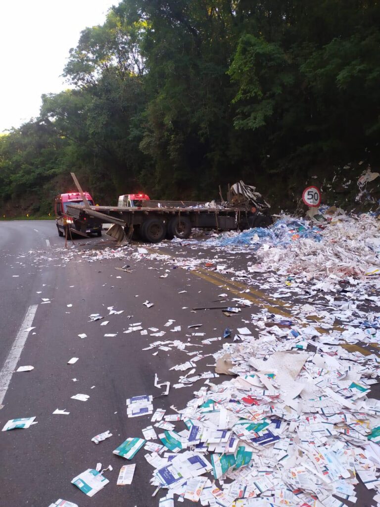 Grande parte da carga se espalhou sobre a BR-282, causando trânsito intenso.