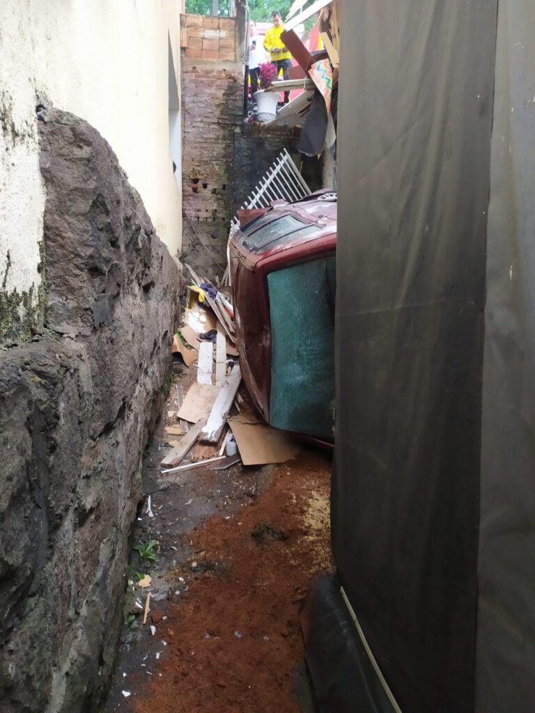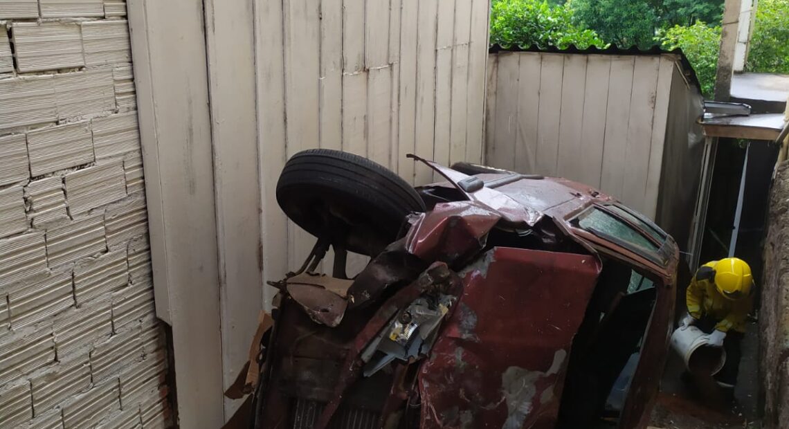 Acidente impressionante em Joaçaba: carro despenca em residência e assusta moradores