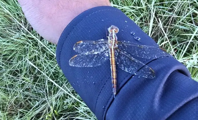 Um dos momentos mais marcantes da manhã foi registrado pelo fotojornalista Mycchel Legnaghi, que encarou as temperaturas negativas do vale para documentar o fenômeno. Ele encontrou uma libélula com as asas congeladas pela geada. O inseto, incapaz de se mover, precisou de apoio para descongelar e conseguir retomar o voo após o sol começar a aquecer a região.