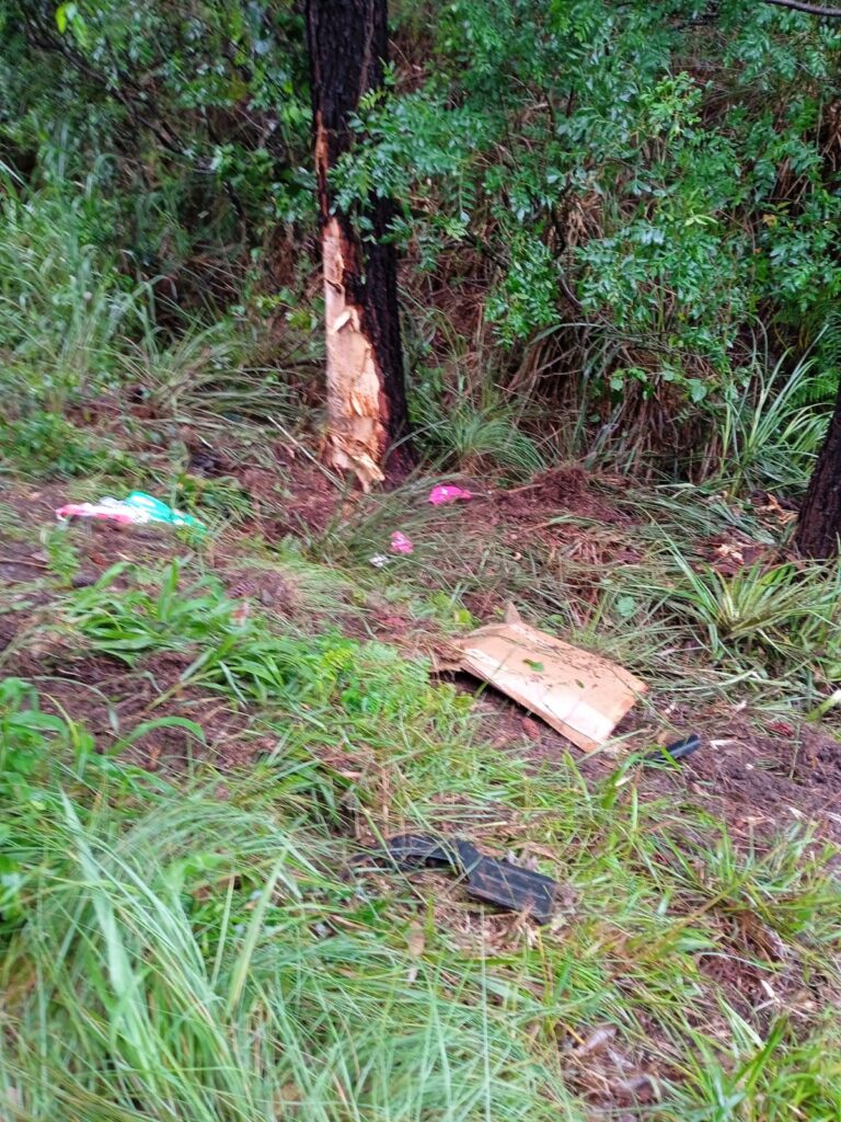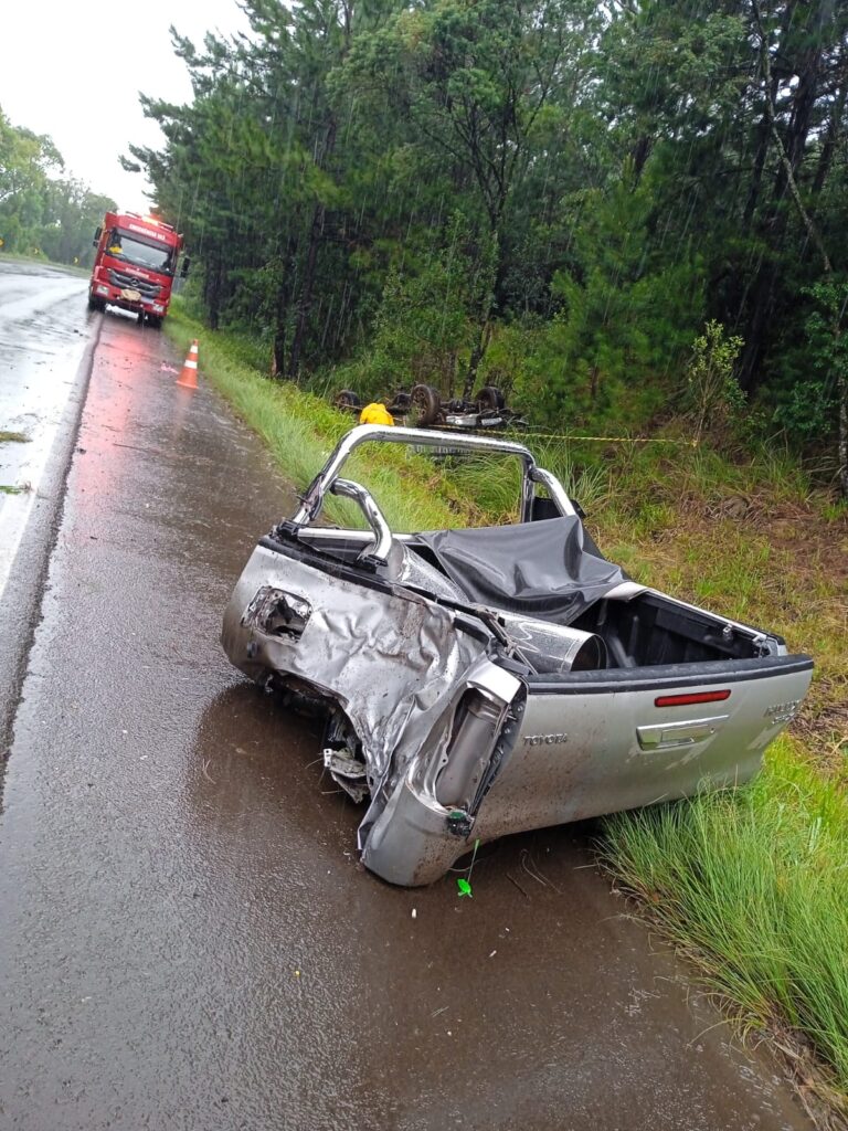 No local, as guarnições confirmaram que uma caminhonete Toyota Hilux, com placas do padrão Mercosul, saiu da pista e atingiu violentamente uma árvore. Com a força do impacto, o veículo acabou se partindo em duas partes, evidenciando a gravidade da colisão — situação que chama a atenção nas imagens registradas no local.