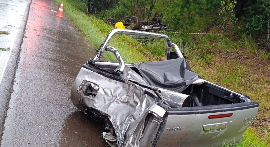 No local, as guarnições confirmaram que uma caminhonete Toyota Hilux, com placas do padrão Mercosul, saiu da pista e atingiu violentamente uma árvore. Com a força do impacto, o veículo acabou se partindo em duas partes, evidenciando a gravidade da colisão — situação que chama a atenção nas imagens registradas no local.