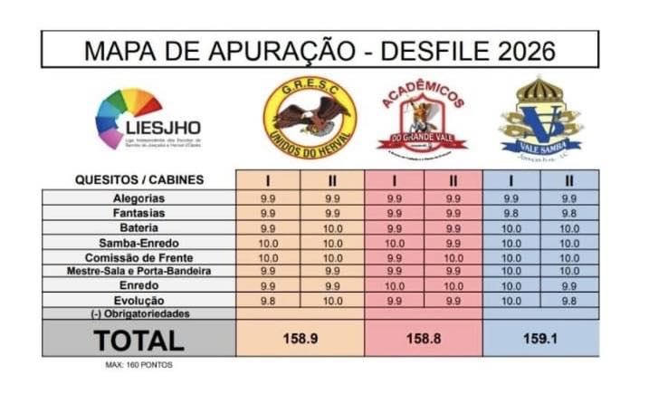 Confira as notas que cada escola recebeu dos jurados nos quesitos que foram julgados.