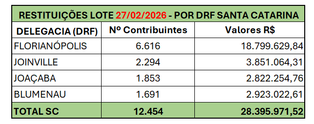 A Delegacia da Receita Federal em Joaçaba confirmou que 1.853 contribuintes da região estarão contemplados no lote residual de restituição do Imposto de Renda Pessoa Física (IRPF) referente ao mês de fevereiro. O pagamento será realizado no próximo dia 27 de fevereiro de 2026 e soma R$ 2.822.254,76 em créditos que serão depositados diretamente nas contas bancárias informadas nas declarações.