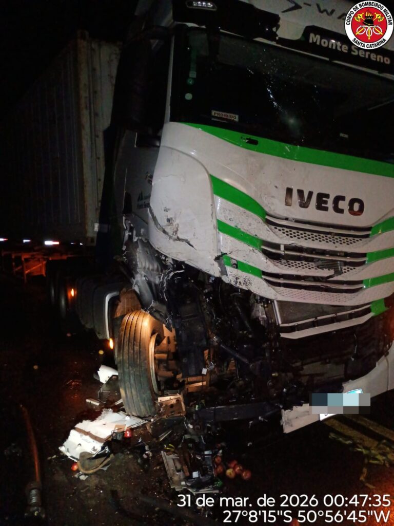 Um grave acidente de trânsito mobilizou o Corpo de Bombeiros na noite de segunda-feira, 30/03, em Monte Carlo. A ocorrência, registrada por volta das 23h20, envolveu dois caminhões e uma caminhonete e chamou atenção pela intensidade do impacto.