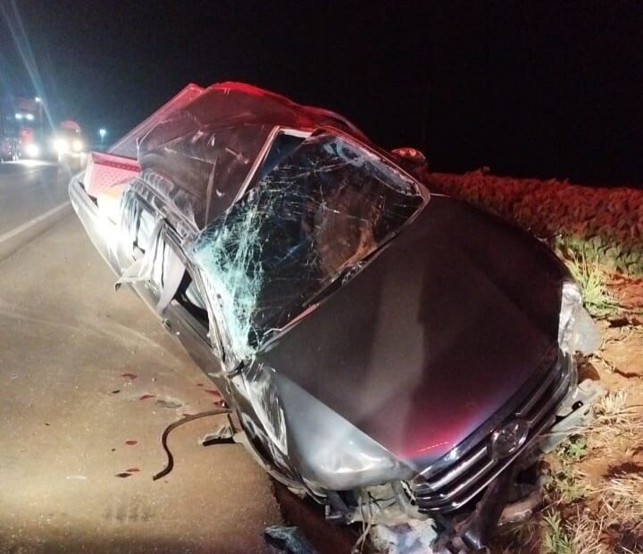 O acidente mobilizou equipes do Corpo de Bombeiros e do SAMU. A ocorrência envolveu uma Toyota Hilux com placas de Campos Novos, que saiu da pista e capotou às margens da rodovia.