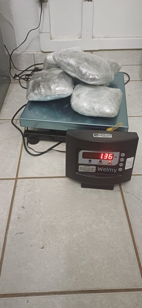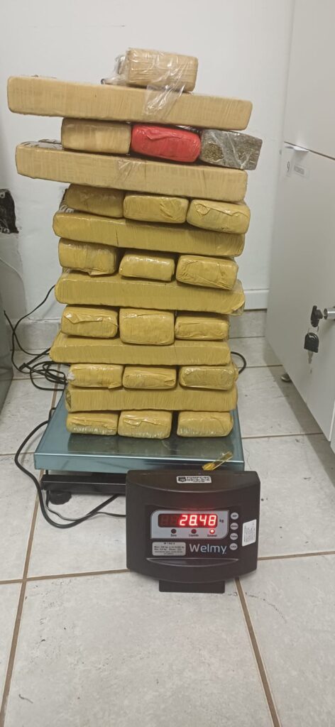 No interior do automóvel, os policiais encontraram uma mochila com aproximadamente 30 quilos de drogas, entre skunk e maconha. Além do motorista, uma mulher e um bebê de cerca de dois anos também estavam no carro. A criança era transportada em cadeirinha.
