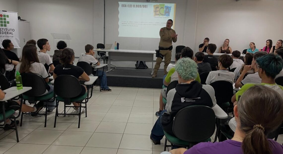Nesta terça-feira, 07 de abril de 2026, a Polícia Militar de Santa Catarina, por meio do 26º Batalhão de Polícia Militar, promoveu uma palestra no Instituto Federal Catarinense – Campus Luzerna, direcionada aos alunos da instituição. Durante a atividade, foram abordados pontos do Estatuto da Criança e do Adolescente (ECA), com destaque para os direitos e deveres dos jovens, além das implicações legais relacionadas ao ato infracional. A iniciativa buscou reforçar a responsabilidade dos adolescentes diante de suas atitudes no dia a dia.