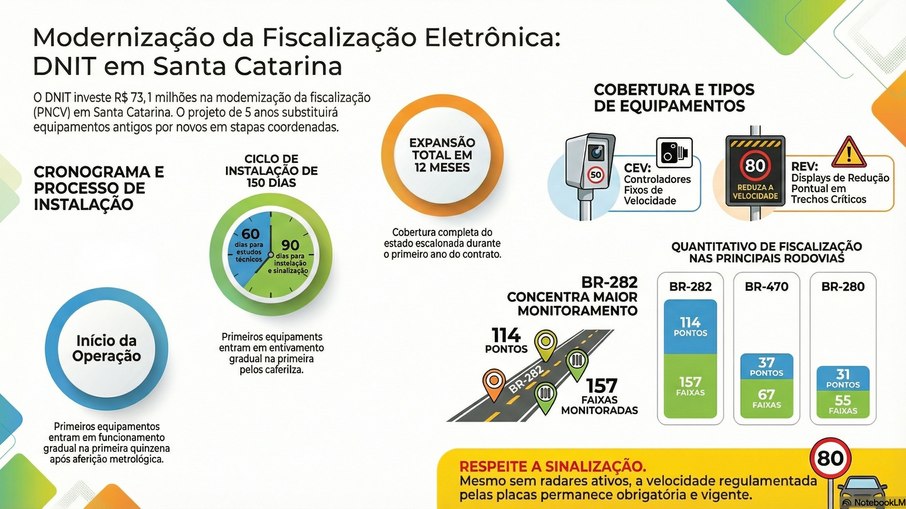 As principais rodovias de Santa Catarina recebem as instalações, sendo elas: BR-282, BR-153, BR-158, BR-470 e BR-101. A 282 concentra maior monitoramento nessa fase inicial. Com os novos equipamentos, infrações retornam a ser emitidas de forma automática.