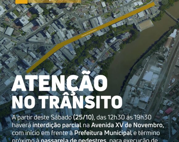 Interdição parcial neste sábado (25/10)!Das 12h30 às 19h30, a Av. XV de Novembro terá bloqueio entre a Prefeitura e a passarela de pedestres para obras da Celesc. Fique atento à sinalização e planeje seu trajeto!