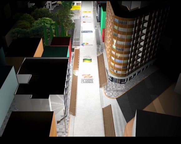 Uma computação gráfica mostra como vai ficar a avenida XV de Novembro para os desfiles das Escolas de Samba. Uma mega-estrutura será montada com camarotes e arquibancadas para acomodar o público. Fonte: Produtora Real Time