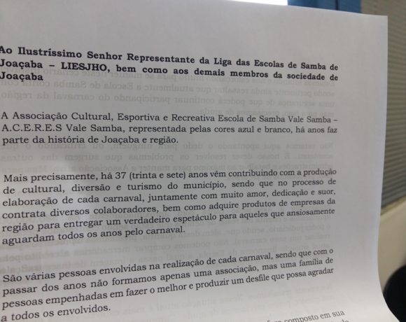 A Escola Vale Samba divulgou na tarde desta quinta-feira (05) uma carta à imprensa oficializando a não participação no Carnaval deste ano. No documento de três páginas a diretoria da Escola explica os motivos que levaram a tomar tal decisão. Logo de início, após um breve resgate histórico, o documento tece críticas a pessoas que […]